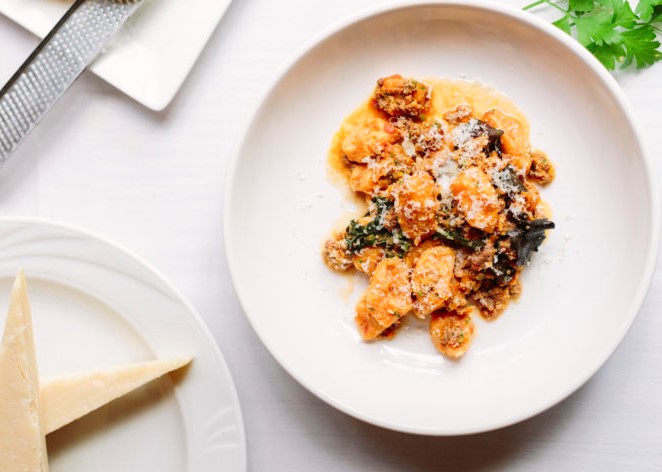 Kitchen confidential: My assignment is to go behind the scenes with Chef John Piombo, following him for a couple hours while he prepares for a busy night inside Nonna’s at The Homestead. Truthfully, to make that happen, I would have to tether myself to one of his black chef Crocs, given that he is darting between the front of the house—where gleaming silverware and stoneware plates catch the reflection of fire crackling in the two-sided stone fireplace—and the back of the house where his staff is preparing the line for a busy night.