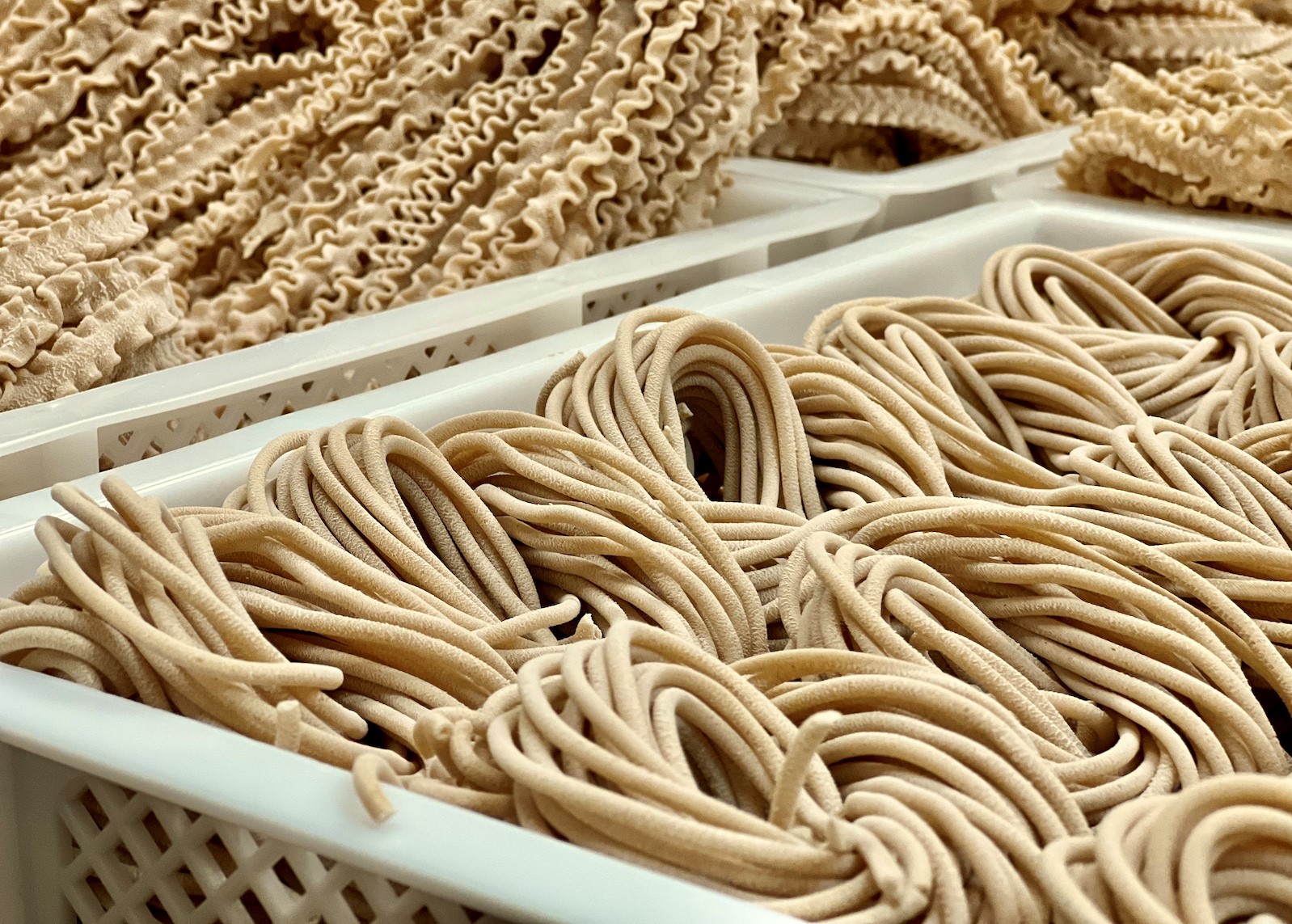 The pastas – made by owner Petra Orlowski using finely milled organic durum wheat flour from Central Milling in Utah and locally grown stone ground flour from Wisconsin's Meadowlark Organics – were extruded with Italian bronze dyes, leaving their exterior purposefully rough so that it catches every drop of tasty pasta sauce.