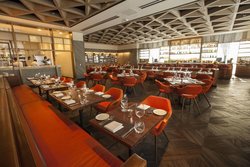 The space, which you can see in the gallery above, is refined, but not too fancy to discourage casual passersby. Wood table tops with comfortable chairs decked out in a resplendent orange, along with a number of half-circle booths feature throughout the room.