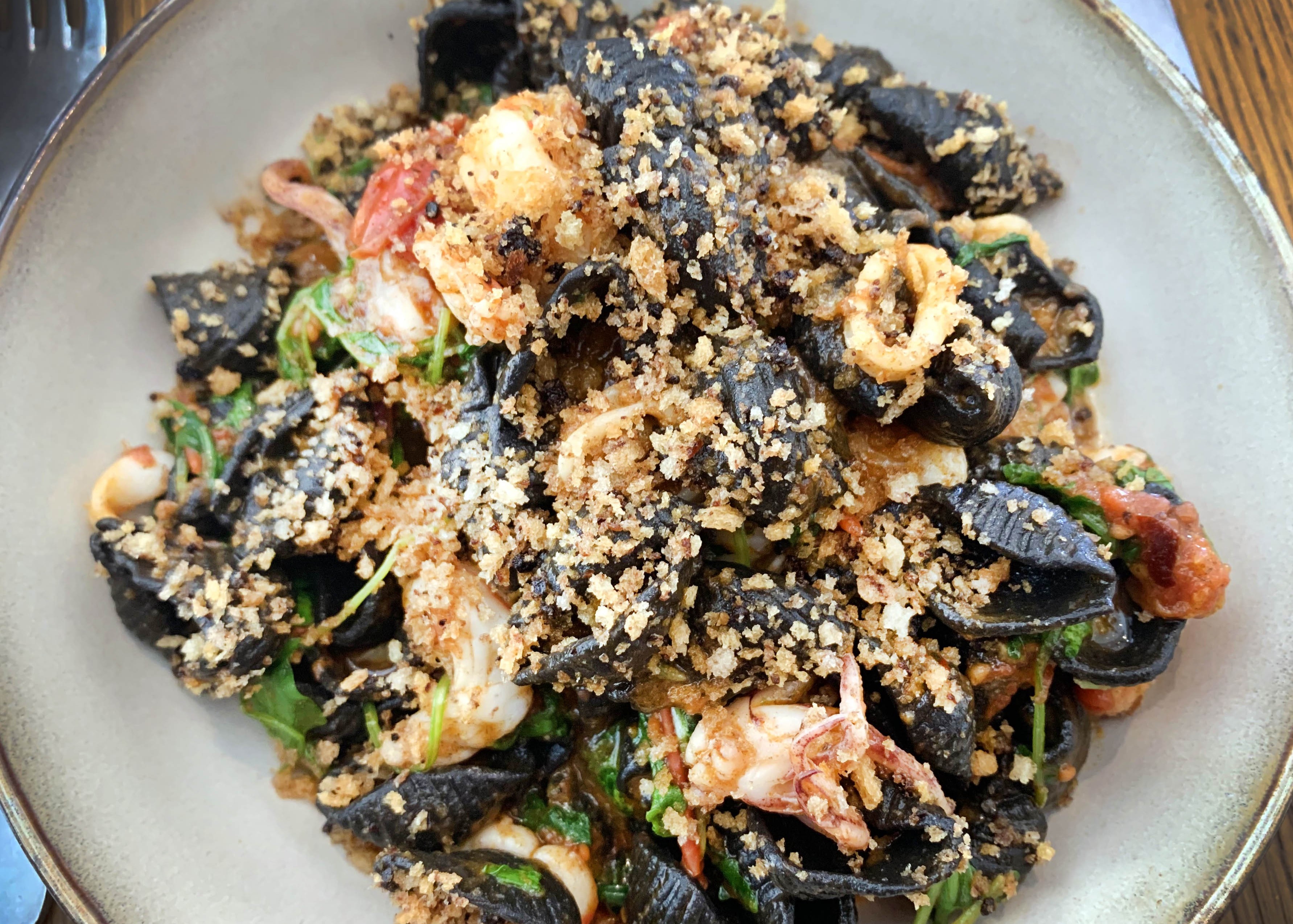Carmellini's skill is evident in San Morello's black shells puttanesca, a dish with big, sweet pink shrimp and small rings of tender calamari among a perfectly salty mix of shells, sweet cherry tomatoes, olive oil, garlic, chili, white wine, anchovy, arugula, and breadcrumbs with dehydrated olives, capers, and anchovy that provides a textural contrast. It's a plate to behold, especially in Detroit.