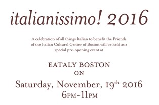 Please join us for a celebration of all things Italian to benefit the Friends of the Italian Cultural Center of Boston: an exclusive pre-opening event at Eataly Boston – 800 Boylston St. Starting at 6 p.m., Eataly Boston will become a foodie paradise with never-ending food, drinks, and beyond, exclusively for italianissimo! guests.
