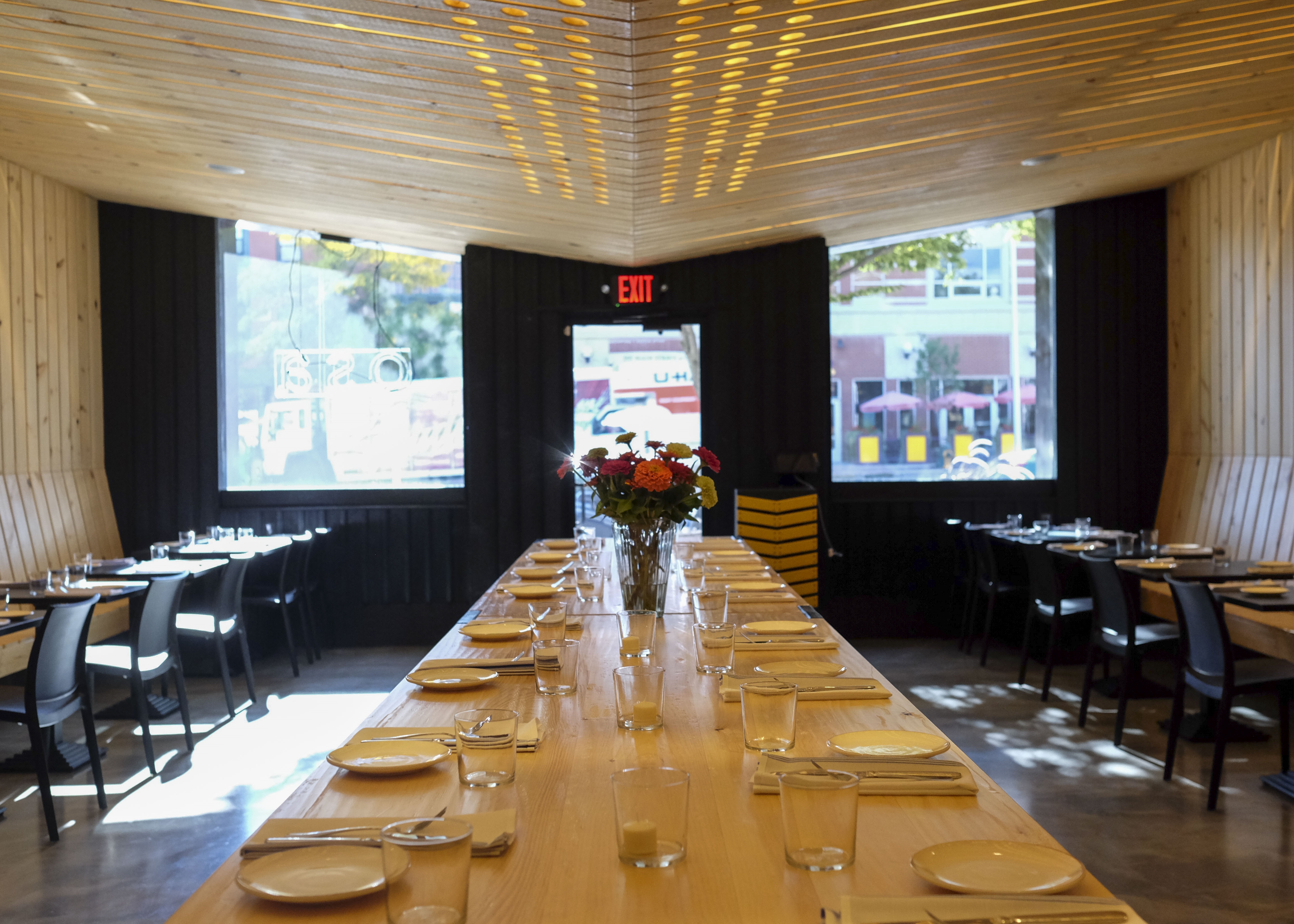 Students returning to campus in early September were greeted by a new restaurant on Main Street’s North End. With its wooden gate, black-and-white woodwork, and neon sign, Osa is definitely eye-catching. Inside, the pitched ceiling and long table at the center of the room draw the eye to the bar and a view into the kitchen.