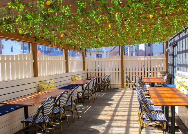 In the Amalfi Coast, patios embrace the wild vines growing around the restaurant; Pazza on Porter has brought in these elements of Italy to their East Boston location with teak tables and the classic duo of blue and yellow.