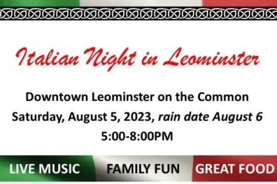 Downtown will be awash in green, white, and red for a family friendly festival slated for Aug. 5 that is being billed as Italian Night in Leominster, MA. The entire community is invited to the event that will go from 5 to 8 p.m. and feature fun activities for all ages, authentic entertainment by Ambrosiani!, Providence, Rhode Island’s premiere Ital...