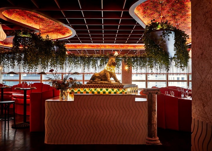 The main dining area, styled by GRT Architects, is decked out in maximalist motifs: wavy light fixtures with spherical bulbs attached, orange banquettes, droopy lush greenery, mosaic accents, plus a marble bar front kitted out in a pattern of brownish-orange and light-green.