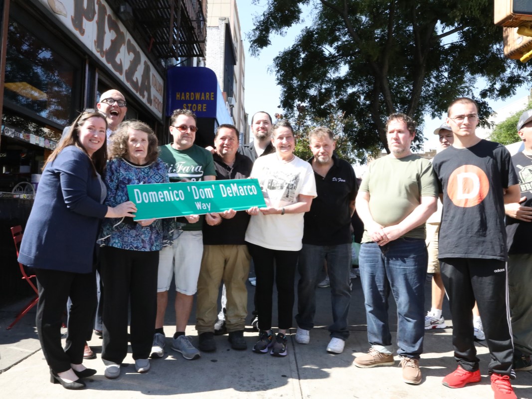 It’s a slice of history! New Yok City officials gathered at the corner of East 15th Street and Avenue J on Saturday to pay tribute to the late Domenico “Dom” DeMarco, the legendary pizzaiolo behind Di Fara Pizza, with a new commemorative street sign. DeMarco, the beloved patriarch of Di Fara, founded the Midwood pizzeria and crafted its legendary pies for more than 50 years. He died in 2022 at the age of 85.