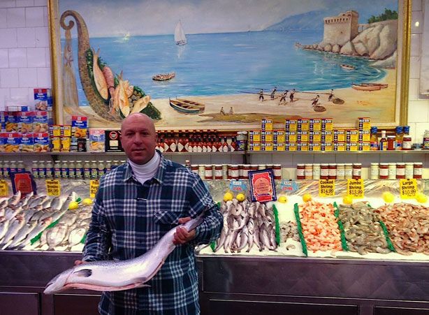 There's Casa della Mozzarella, where all day long three guys make mozz fresh so it comes out warm for every customer willing to wait up to an hour in line to squeeze into the place. There's Cosenza's Fish Market, where when John and Joe Cosenza get to know you, they'll tell you about the best branzino or scungilli to swim in the morning. The crabs are twitching in the stall, the lobsters moving in their tank. Outside you can join the throng knocking back raw clams with squirts of lemon and Tabasco.