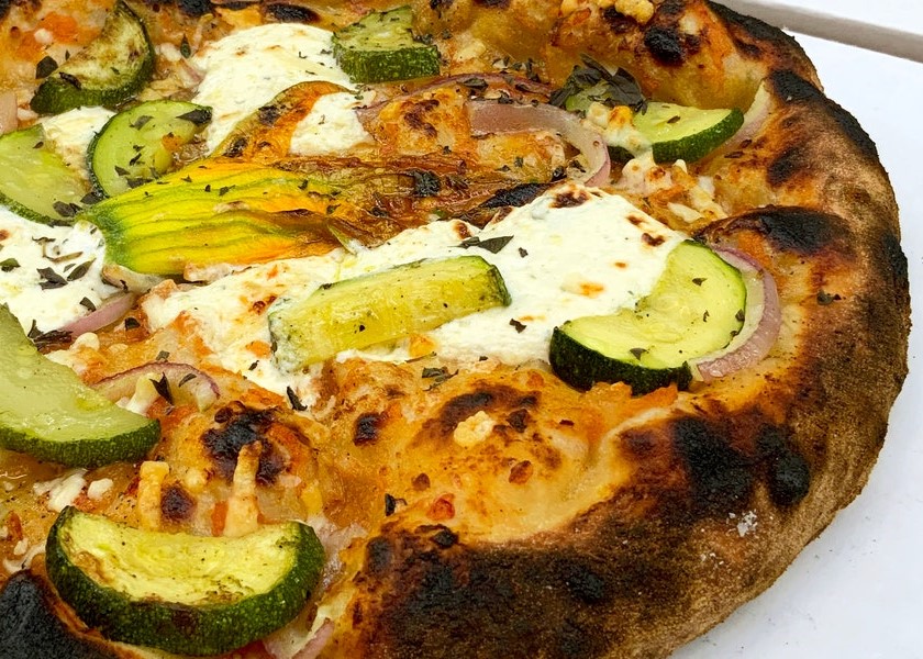 He’d already begun to tweak the menu, but hadn’t gotten around to fine-tuning the pizzas yet. Finding himself at home, he decided to create his own starter from scratch, and to play around with whole grains. Eventually, he created and perfected a new whole grain sourdough pizza crust recipe, which he began serving at Peasant this summer, soon after the restaurant reopened.