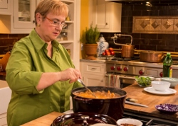 The kitchen is equipped with a rotisserie grill (a subject of many fan emails), a giant stove Bastianich refers to as "my Ferrari" and a gorgeous waterfront view. "I need to see my stove, then I need to see my table, the guests, and of course nature, water, beauty, flowers," she says. "I need that to stimulate me to feel good. I cook better when it looks better, just like a typical Italian."