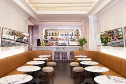 Chef Massimo Solo fires up Mammoliti family recipes and favorites inspired by the original. New York–based Riscala Agnese Design Group helped realize Mammoliti's vision for a Provençal interior, filling the space with whitewashed brick, exposed beams, marble tables, leather banquettes, and tweed stools. It was also important that the setting recall its French ancestor, which occupies the wine cellar of an old monastery.