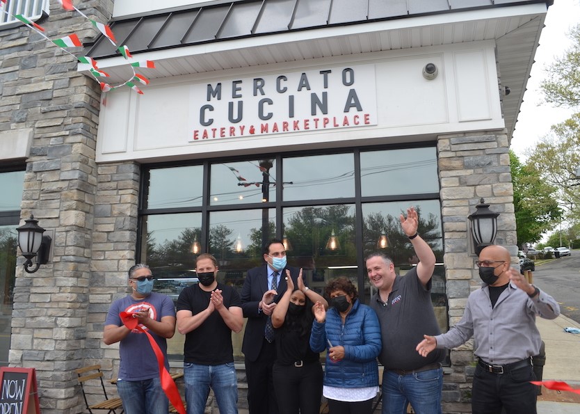 Mercato Cucina is officially open and ready to serve chef David Buico’s childhood favorites. The Brooklyn-born chef and owner, his girlfriend and business partner Debbie Stone, Town of Huntington officials, family, and friends all joined together outside of the Italian marketplace to celebrate the momentous day.