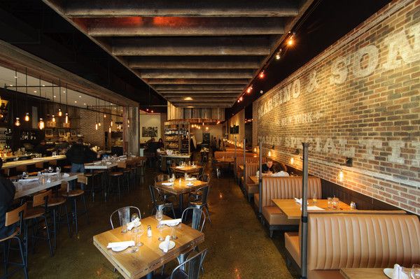The interiors blend the old with the new: warm tones including bronze and chocolate are fused with textures like leathers, woods, and marble. Additional touches such as exposed filament bulb lighting, marble hostess stands, and iconic black and white porcelain tile flooring further the rustic and modern style.