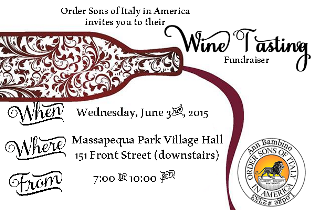 Ann Bambino Lodge #2353, Order Sons of Italy in America invites you to our Wine Tasting Fundraiser. $25 per person, paid at the door. RSVP in advance is STRONGLY recommended by calling Anne Marie at (516)242-4475 or email info@annbambinolodge.org.