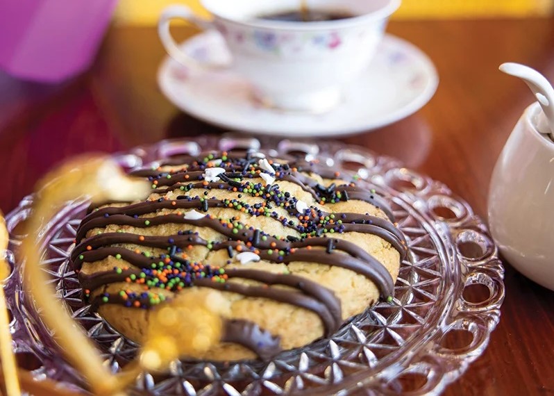 Beside the coffee bar, a cabinet holds a deluge of mismatched teacups and saucers; at the entrance, a pastry case overflows with Dragon Fruit Cannolis, Raspberry-Pistachio Tres Leches, and Lemon Meringue Cheesecake. The menu beside the register lists a selection of sandwiches and brunch items as well.