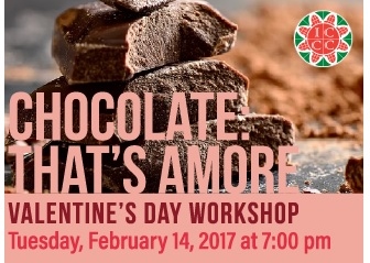 Chocolate: That's Amore! A Valentine's Day Workshop. Join us for a sweet and chocolaty evening on Valentine’s Day! Come experience a hands-on chocolate workshop where guests will have the opportunity to have some fun dipping strawberries, biscotti and truffles to make their very own delicious Valentine treats. Come celebrate San Valentino with your other half or with friends (chocolate dipping stations will be set up for two).