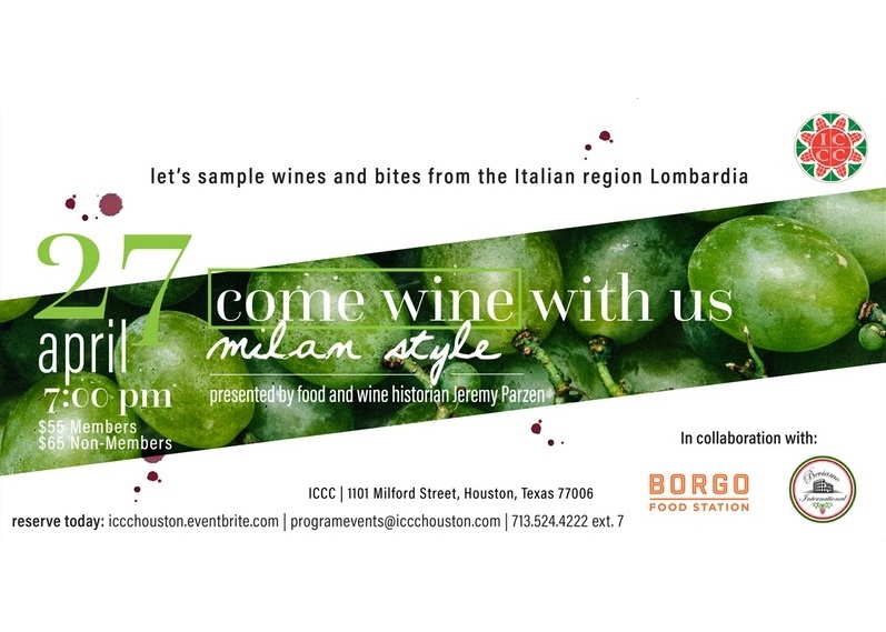 Dear Members and Friends, Join us at the ICCC for an evening Milan Style on Thursday, April 27, 2017 at 7:00 pm; the second edition of 2017 of our wine tasting series Come Wine with Us, which debuted in June of 2016. It will offer a selection of wines from the Northern Italian region of Lombardia, presented by Food and Wine Historian Jeremy Parzen. These wines will be paired with Borgo Food Station Chef Monica Fallone’s delicious bite-size creations.