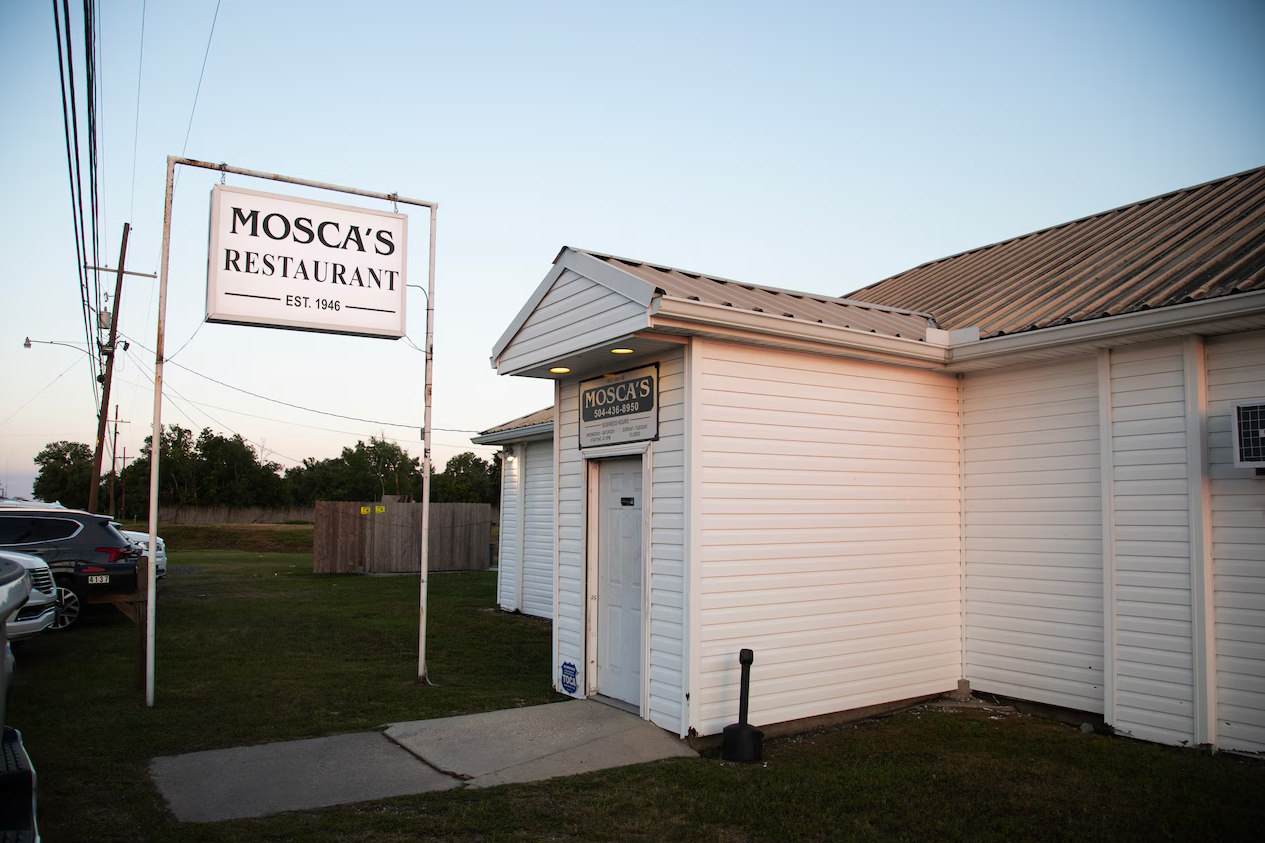 Mosca’s restaurant isn’t the kind of New Orleans-area tourist destination you stumble upon by accident. The long-standing Italian joint is a 30-minute drive outside the city, located on the edge of a large swath of forest on the West Bank of the Mississippi River. The squat white building looks more like an illegal fireworks store than a place you’d stop for dinner.