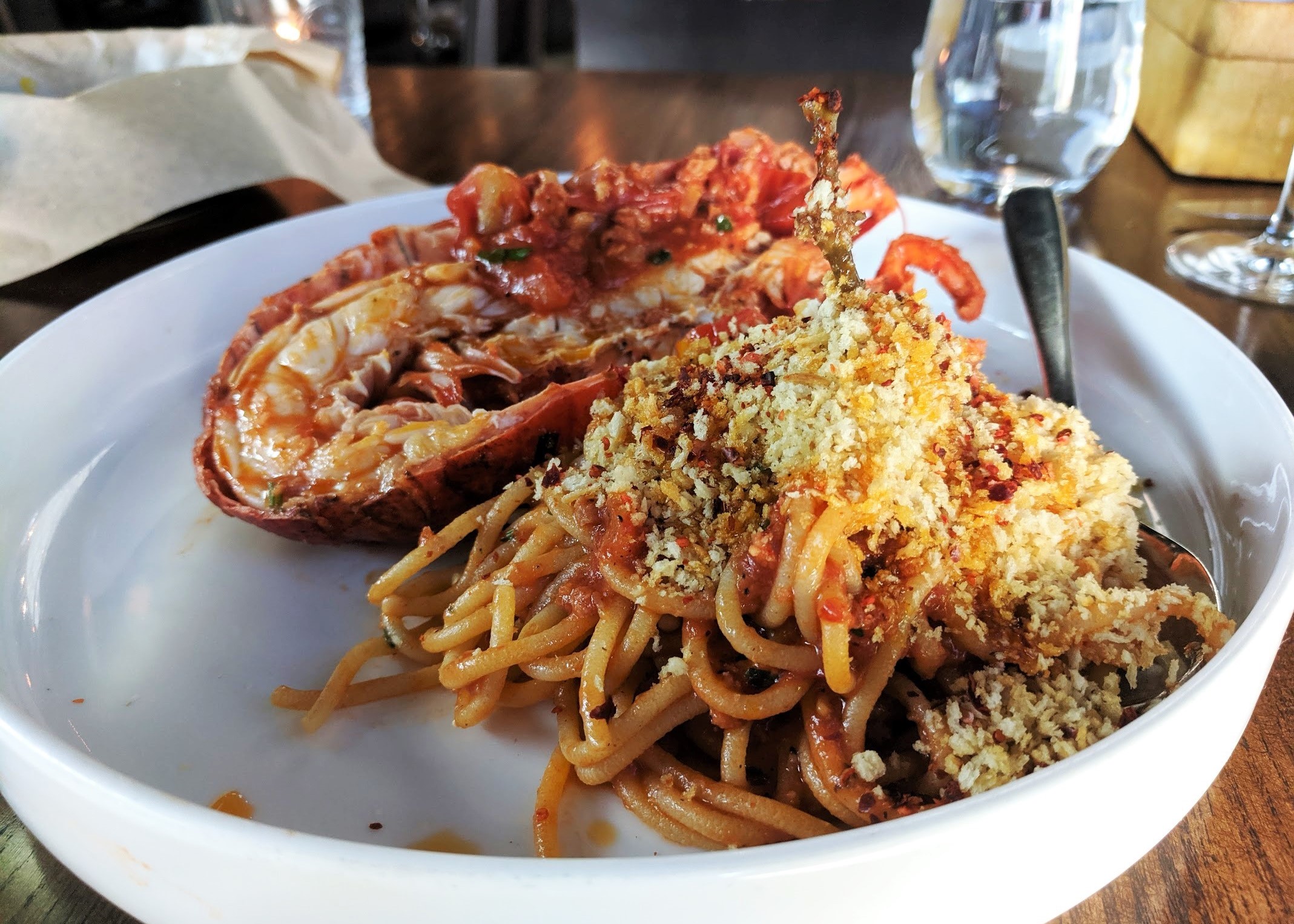 But at 7 p.m. on a recent Friday, the expansive, well-lit, gorgeous dining room — which Ornella Ellard designed — sat nearly half-empty. Where is everybody, and why don’t they know how good this restaurant’s summer pastas are? Just look at the photo at the top of this story. Mille Lire has a bowl of spaghetti with a spicy Calabrian chile and cherry tomato sauce that’s garnished with half a freaking lobster ($36). And here’s the thing: It’s not even my favorite pasta there!