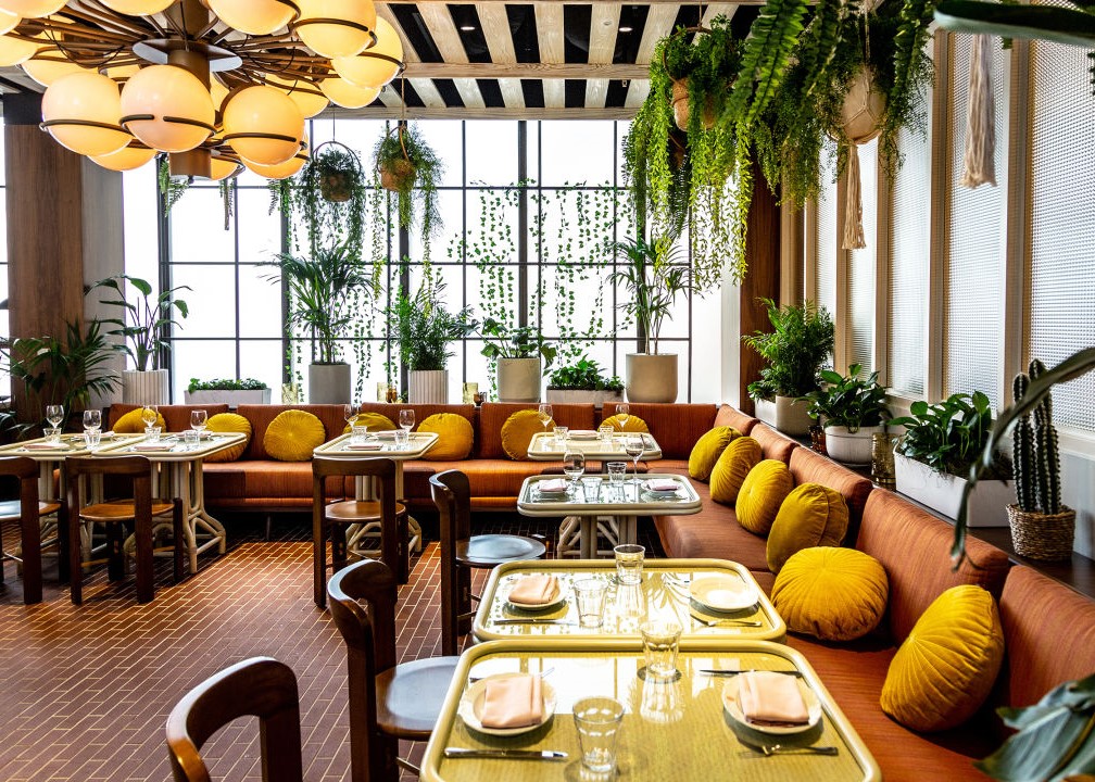 The front bar, with its cozy lounge area, feels like a dimly lit living room, while a window into the kitchen affords a glimpse of the restaurant’s centerpiece, a ceramic-tile pizza oven painted with goldenrod roses. In the wood-paneled dining room, shelves hold thrift-store finds like cookbooks, vinyl record sleeves, and retro tube televisions, surrounding banquettes that encourage diners to sink in.