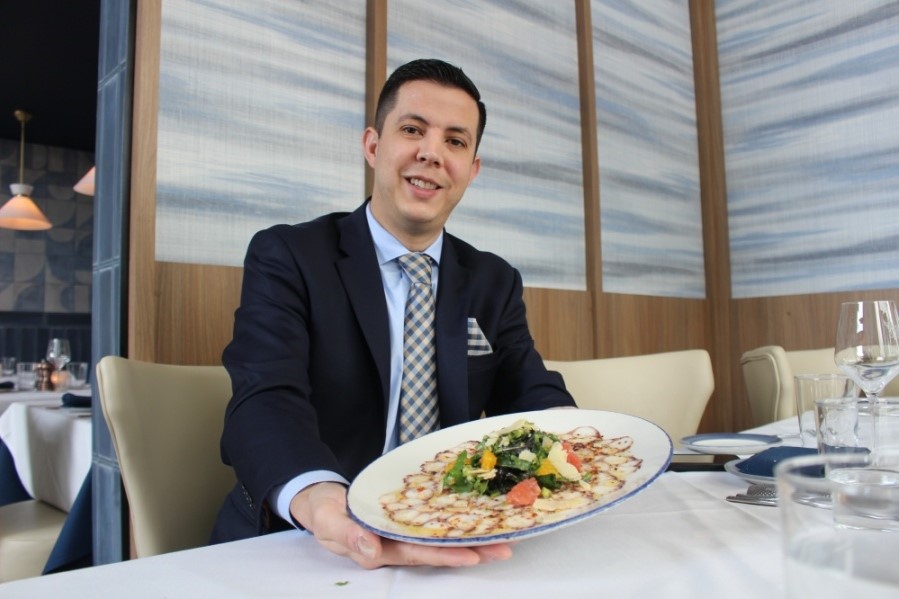Shades of blue and white are reflected throughout the interior of Azzurro, a new concept from the local restaurateur Enrique Orioli meant to transport visitors to the Amalfi coast and experience the tastes of Italy.