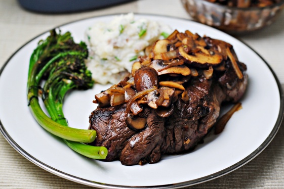 And I don’t know about about you, but it takes me a little while to finish a steak that size. That’s just what I did. And I soaked up each bite with the Marsala sauce, which is basically a red wine/mushroom/beef stock concoction. A saucy 16 oz ribeye topped with mushrooms, sauteed onions and roasted peppers is my modus operandi. But when it’s serve...