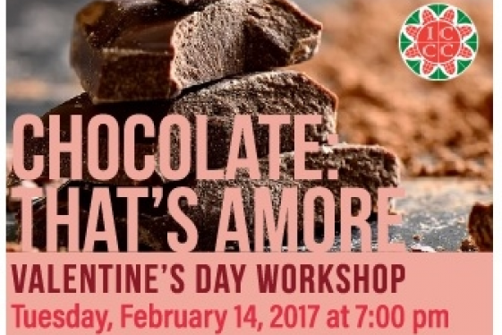 Tuesday, February 14, 2017. Events starts at 7:00 pm, doors open at 6:30 pm. Previous registration is required: $35 for members, $40 for non-members. Italian Cultural & Community Center - 1101 Milford - Houston, TX Chocolate: That's Amore! A Valentine's Day Workshop. Join us for a sweet and chocolaty evening on Valentine’s Day! Come experience a ha...