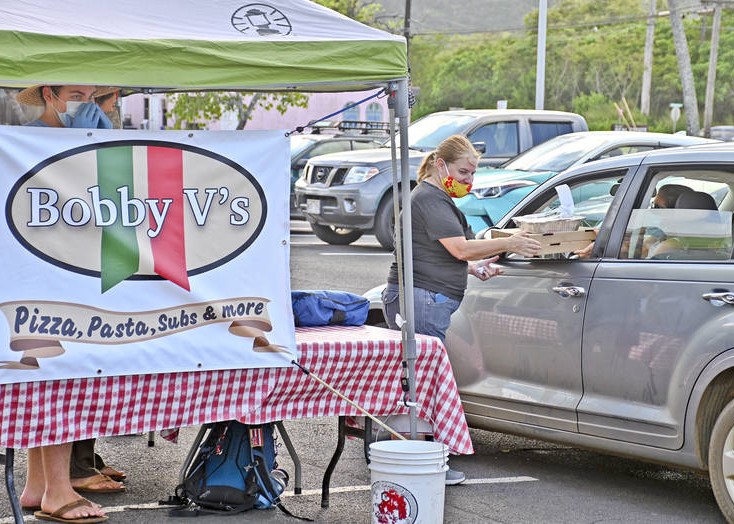 Bobby Valenti of Bobby V’s Italian Restaurant and Pizzeria stopped off with a $10,000 check for the Kaua‘i Independent Food Bank Tuesday while during his shopping errands in Lihu‘e. “We’re open,” Valenti said. “We opened Monday night with our full menu following the same hours (4 to 7 p.m.) as the Bobby V’s drive-thru Friday evening.”