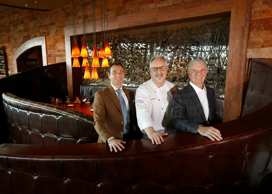 Even in Las Vegas, a city of visually striking restaurants, Panevino Italian Grille cuts a bella figura. There are the 15-foot triangular panes of glass, interlocked at a 15-degree incline to form a sinuous expanse of window framing views of the airport and the Strip. A stacked cornice flows above the glass. Ivy mantles swatches of the exterior, and a trio of pines soars in the circular courtyard entrance.