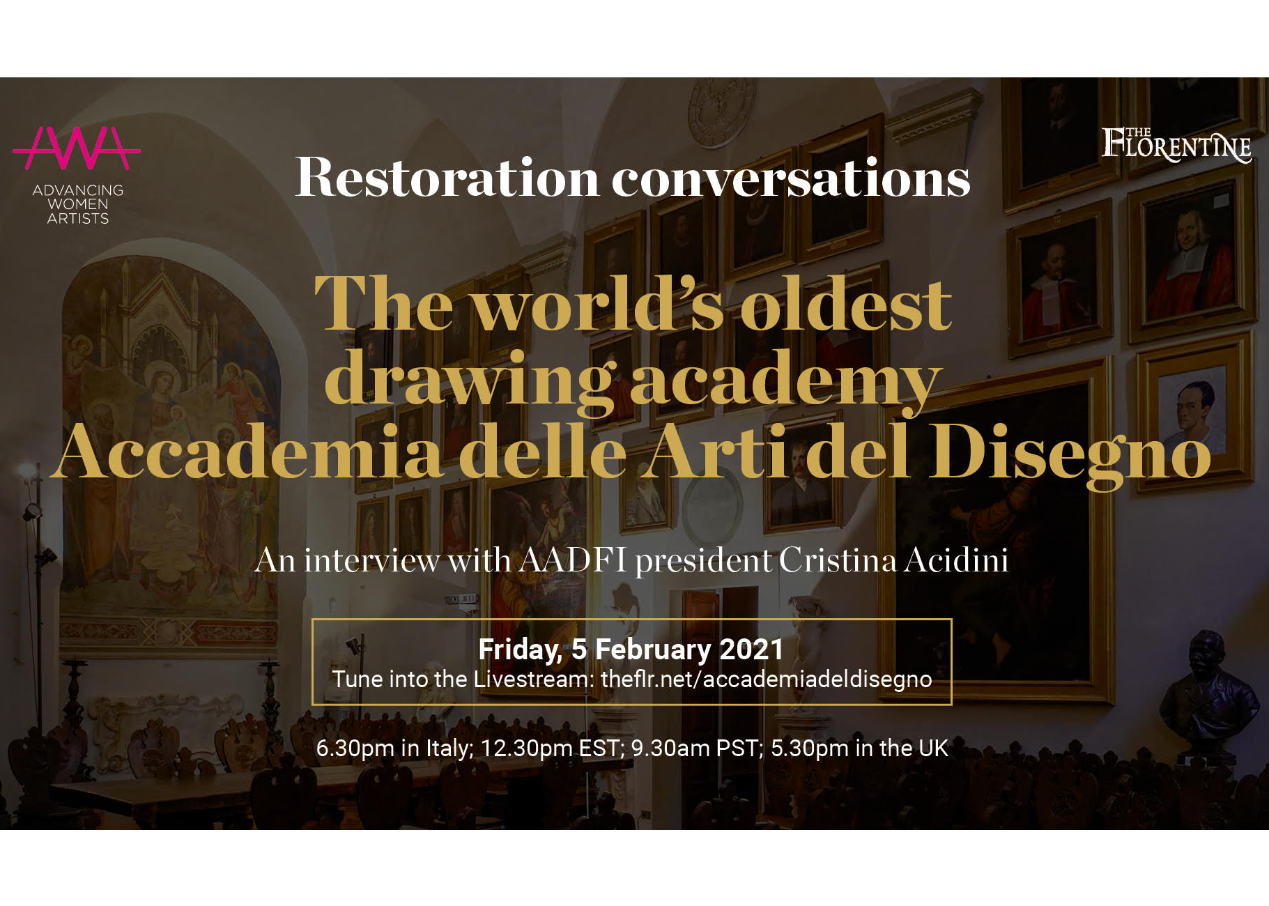 To join the event, tune in LIVE on-line, with organizers Advancing Women Artists and The Florentine, on Friday February 5th at 6.30pm in Italy; 12.30pm EST; 9.30am PST; 5.30pm in the UK. Please use this link: Restoration Conversations: The world's oldest drawing academy, Accademia delle Arti del Disegno or access directly through TF's Facebook and YouTube channels. This event is free.