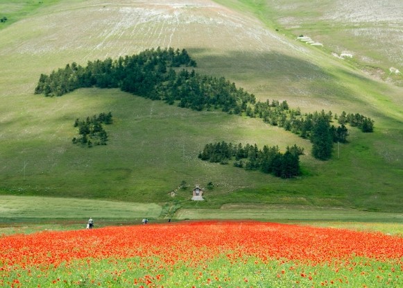 Straddling the central Italian regions of Marche and Umbria, the National Park of the Sibillini Mountains protects the mountain chain of the same name, which includes the highest peak of the Umbria-Marche Apennines, the Monte Vettore (2476m), and the surrounding hilly landscape, dotted with medieval villages, castles and abbeys, farms and cultivated fields.