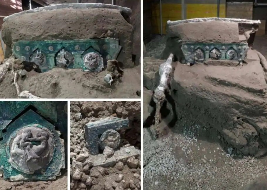 Archaeologists have unearthed a unique ancient-Roman ceremonial carriage from a villa just outside Pompeii, the Italian city buried in a volcanic eruption in 79 AD. The almost perfectly preserved four-wheeled carriage made of iron, bronze and tin was found near the stables of an ancient villa at Civita Giuliana, around 700 meters north of the walls of ancient Pompeii.