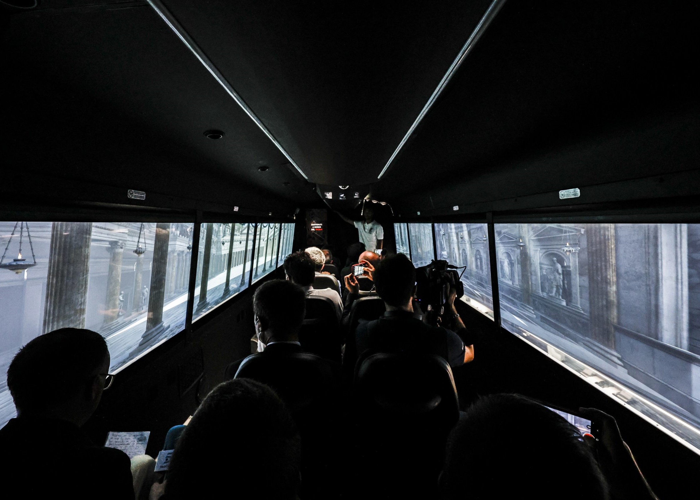 Passengers on the electric bus can view the Imperial Fora, Colosseum, Palatine Hill, Circus Maximus and Theatre of Marcellus thanks to "visor free" VR displays, with all imagery created by visual effects specialists under the guidance of archaeologists.