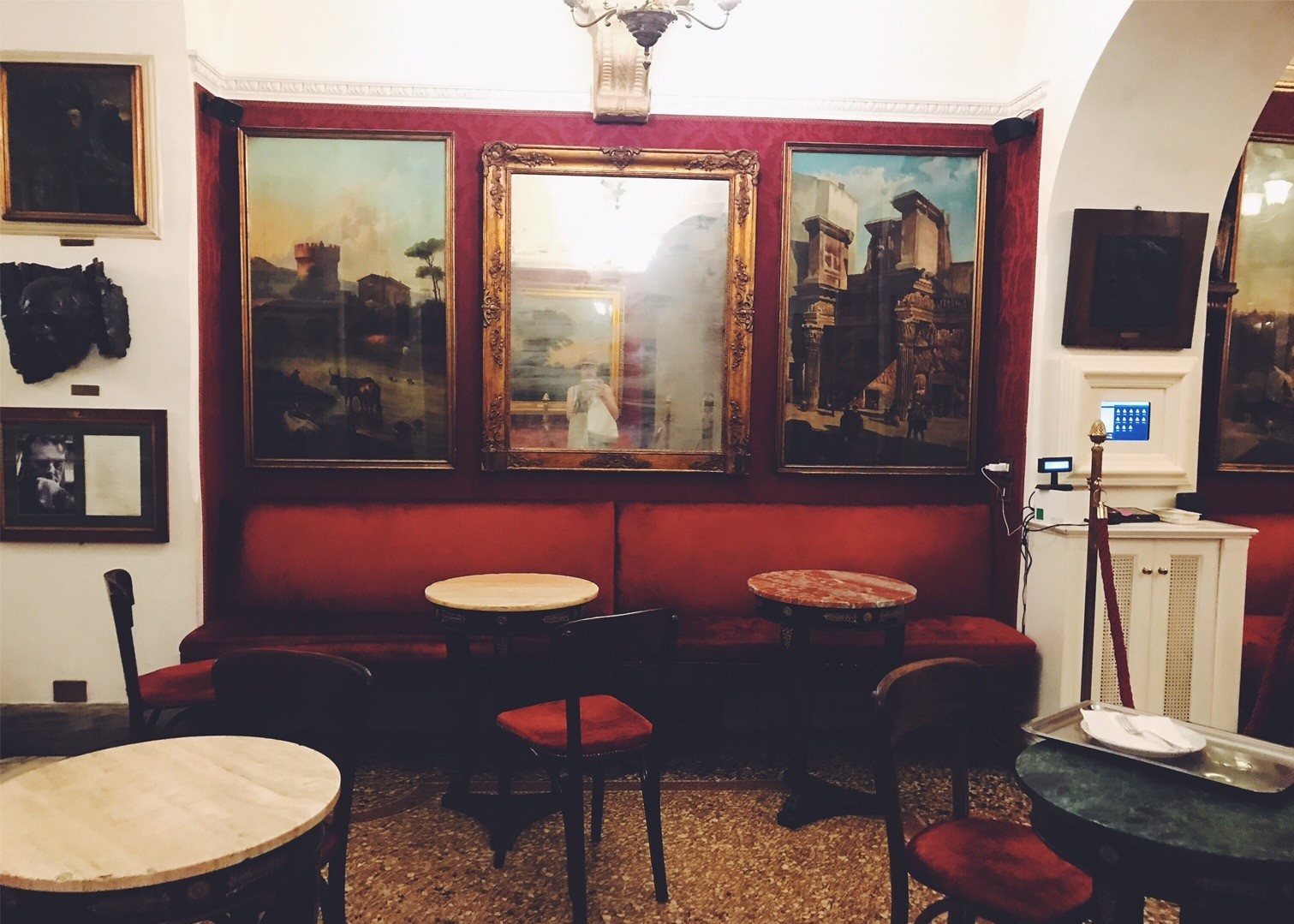 Via Condotti is one of Rome’s most exclusive streets. Lined with designer shops leading up to the Spanish Steps, the elegant road is also home to Rome’s oldest coffee bar – Antico Caffe Greco. Decorated with oil paintings, gilt mirrors and plenty of red velvet – Antico Caffe Greco does feel somewhat like a period cafe. But having been open since 1760, the traditional feel of the coffee bar is authentic.