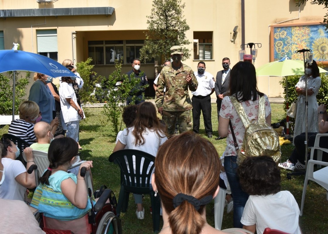 When a group U.S. Army firefighters from Camp Darby walked into Pisa hospital, the eyes on a young man named Federico began to sparkle. Others, Anna, Simone, Lorenzo – all children cared for at the hospital’s pediatric oncohematology and pediatric departments, were filled with amazement as the delegation arrived Monday, to offer a “friendly firefighter” demonstration on fire prevention to them and their families.