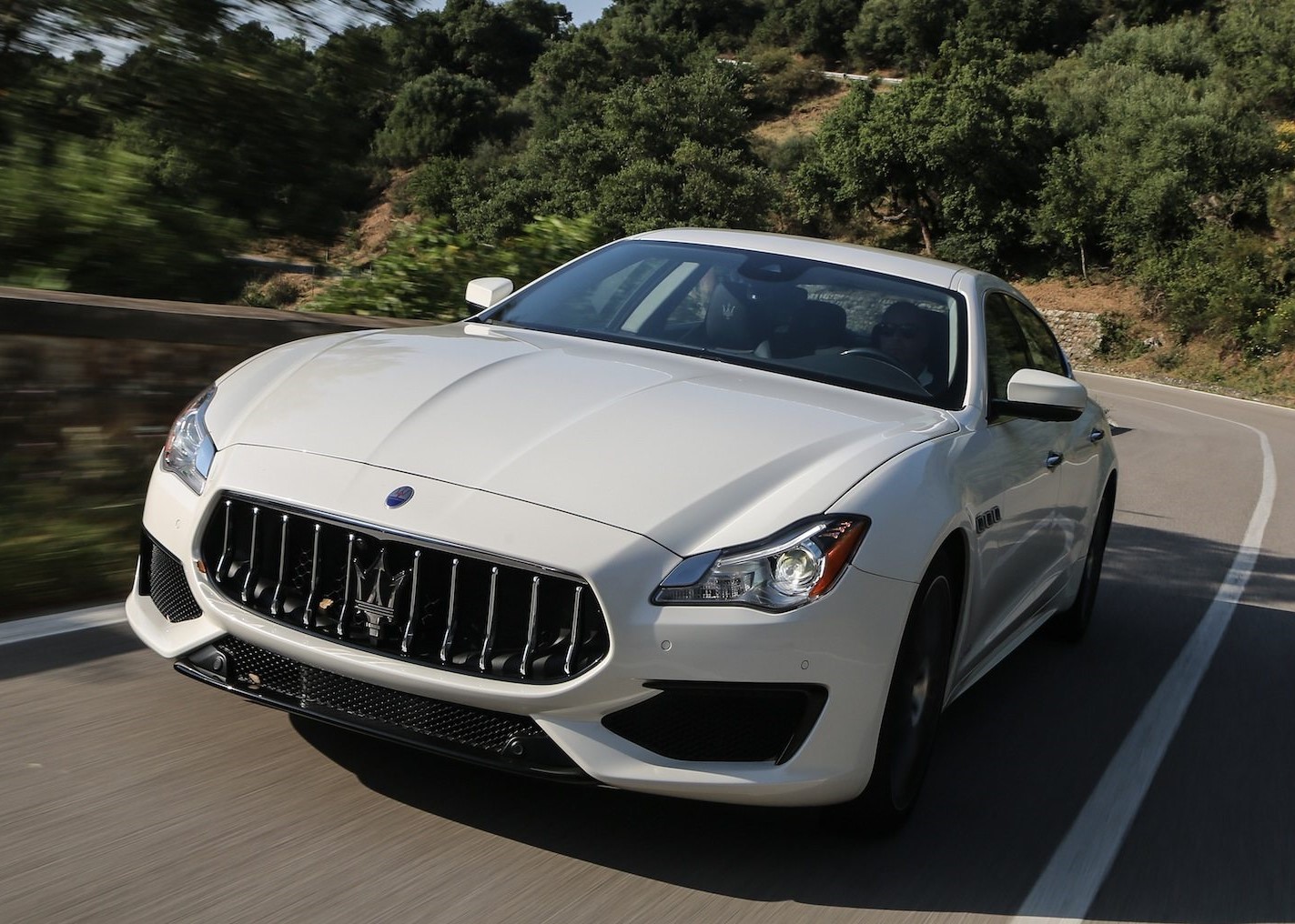 Quattroporte's cabin is luxurious and spacious, with the signature of Maserati artisans evident down to the smallest detail, such as headrests with embossed or embroidered Maserati Trident logos, hand-stitched details throughout, and premium interior materials. Luxurious standard or optional amenities for this sixth generation (introduced in 2013) include remote start, soft-close doors, hands-free power trunk with kick sensor, power-adjustable foot pedals and rear sunshades, and four-zone automatic climate control.