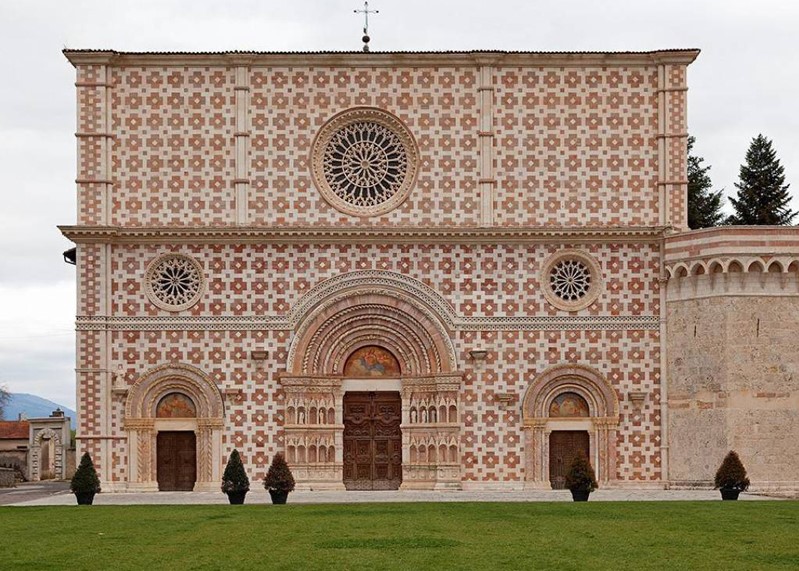 A national monument since 1902, the Basilica in Collemaggio de L’Aquila, outside the city walls on the hill of the same name, is one of the best examples of Abruzzo’s architecture. The church was built in 1288 by Pietro da Morrone, who would become pope as Celestine V only six years later. It has protected its founder’s mortal remains since 1327.