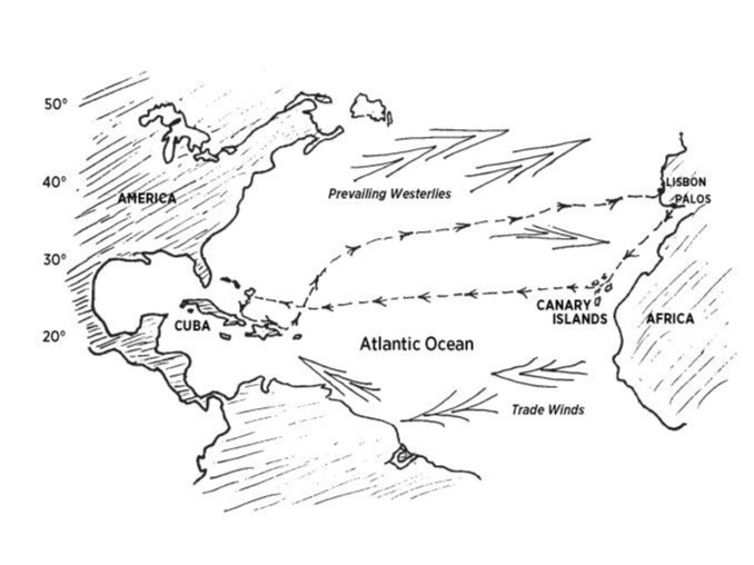 The attached sketch shows the approximate route traveled by Christopher Columbus to reach the Americas and return. It illustrates what he accomplished and the secret to his success. Further, it shows why no previous attempt to establish transoceanic travel had succeeded. A practical sailor can recognize these secrets hidden in plain view on this chart. For those not yet discerning their revelation, allow me to explain.