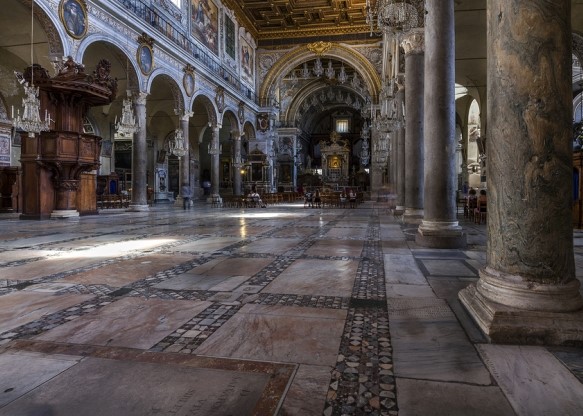 The basilica, dedicated to St. Mark the Evangelist, is located in the small Piazza di San Marco adjoining Piazza Venezia. Paul II, descendant of a noble Venetian family, assigned the church to the Venetian people living in Rome. First built in 336 by Pope Mark I, it was renovated a few times in the Middle Ages, with the addition of new works of art to embellish it, including precious 9th century mosaics in the apse, featuring a blessing Christ in the middle, pope Gregory IV, the one who commissioned the mosaics, to his right holding a model of the church, in the presence of Mark the Evangelist, Pope Saint Mark and other saints.