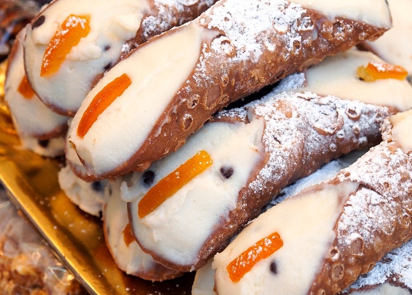 Cannoli, one of Sicily’s best-known desserts, are deep-fried cylindrical pastry shells filled with sweetened whipped ricotta mixed with candied citron and grated chocolate. The size and fillings vary in different parts of Sicily.