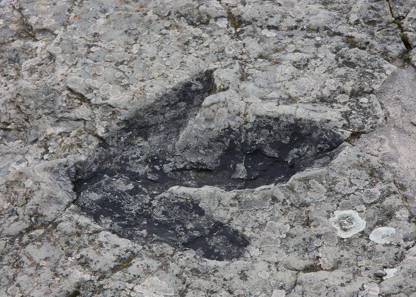 These large herbivorous dinosaurs are estimated to have weighed up to four tons. In one of the five footprints carved into the white rock, leg shapes are visible. In one of them, three toe prints are even distinguishable. They are all within a short distance of each other.