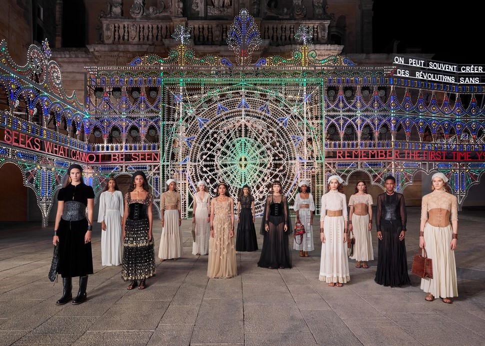 The Parisian house displayed its cruise 2021 collection with no shortage of production value: The scene was set in beautiful Puglia at the Piazza del Duomo in Lecce. Models walked the runway at a social distance. A theatrical stage was built, a full, and fully-masked orchestra played and singers sang, all for an exclusively digital audience who streamed the show around the world.