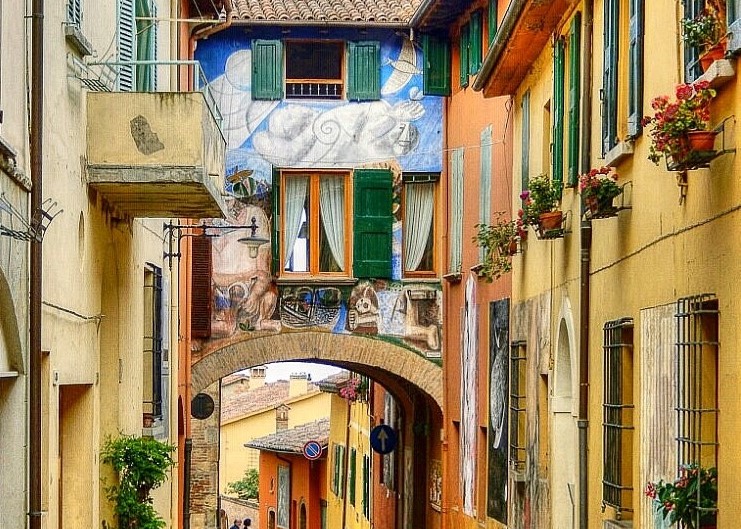 Located around 45 minutes from Bologna, Dozza is a 12th-century medieval village, well-known locally for its art-filled walls. There is a painted wall festival that takes place every two years where artists assemble to create new permanent murals on the walls here.