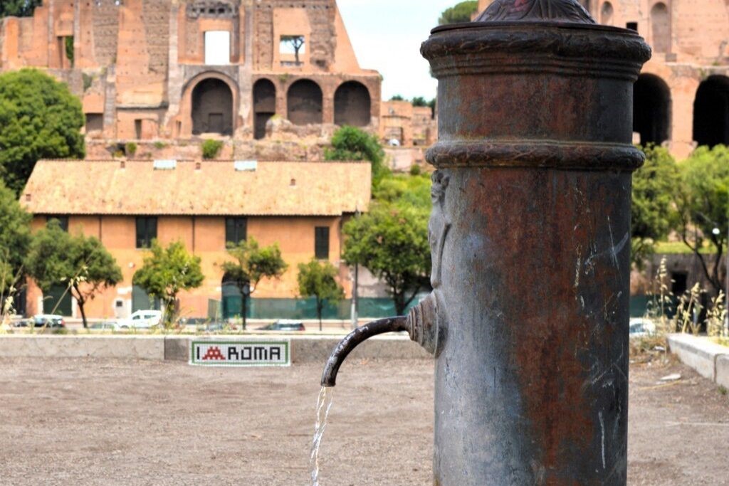 The water in her earlier “monumental” fountains was and usually still is non potabile (undrinkable), but 2025’s tourists and Jubilee pilgrims can count on the some 200 nasoni in the city center to quench their thirst. The other nasoni are located in parks, the EUR business district ((Esposizione Universale Roma), and the outlying residential neighborhoods.