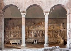 Its centerpiece is a cult icon of the Virgin and Child, thought to date from the sixth century and believed to be the earliest such piece in Rome. After the earthquake, the icon had been transferred to another church in the forum. Santa Maria Antiqua offers visitors a rare glimpse of the iconography of early Christian art, illustrated through a patchwork of wall frescoes dating from the sixth to the late eighth centuries. Maria Andaloro, a historian of byzantine and medieval art and the main curator of the exhibition, described the frescoes as forming "the spinal cord of medieval painting in Rome."
