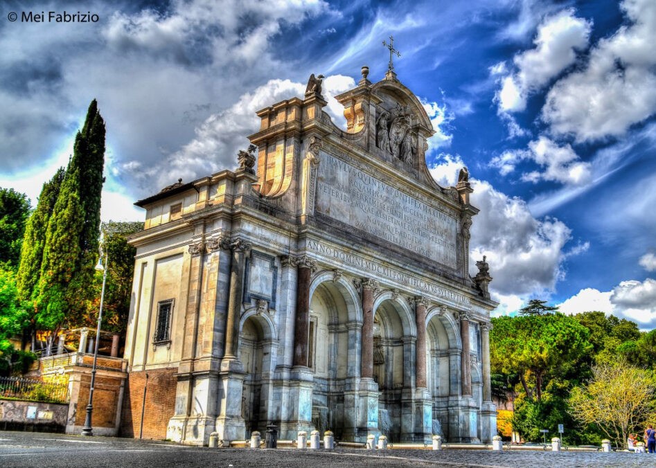 The Fontana dell’Acqua Paola (Acqua Paola Fountain) is one of Rome’s most famous sites and has appeared in movies and songs. Also known as Fontanone del Gianicolo (“the big fountain on the Janiculum”), it rises at the top of that hill. It was commissioned by Pope Paul V, born Camillo Borghese, to celebrate the redevelopment of the Aqua Traiana aqueduct, which received water from Lake Bracciano and supplied water to the districts on the right bank of the Tiber.