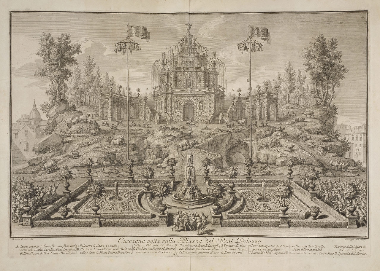 The event was a tradition of Naples and other Italian cities, because nothing caps off a royal wedding or holiday like watching hungry people fight for food. Temporary temples, pyramids, and castles were plastered in roasts, bread, and cheese, which the poor risked their lives to gather.