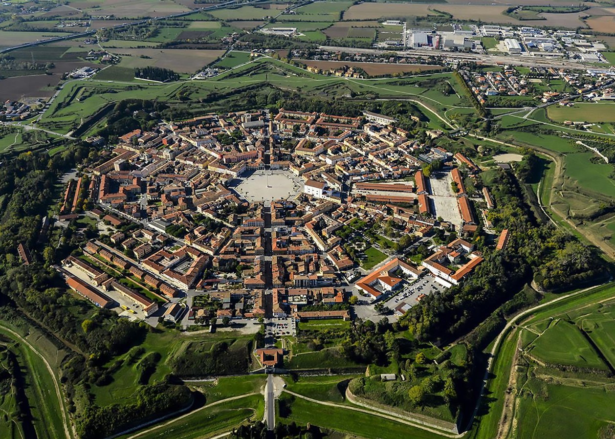 Palmanova is a municipality of about 5000 inhabitants in the province of Udine (region of Friuli-Venezia Giulia) between Venice and Trieste. Its foundation took place in 1593 by the Venetians who built this fortress town with the characteristic polygonal geometry consisting of a nine-pointed star.