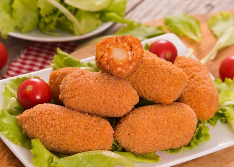 Supplì is a breaded, deep-fried rice croquette with an elongated shape traditionally filled with mozzarella, rice pre-simmered in a tomato-based sauce, and ragù. They’re known as supplì “on the phone” due to the stringy fiordilatte that creates a thread when the crunchy rice ball is broken in two.