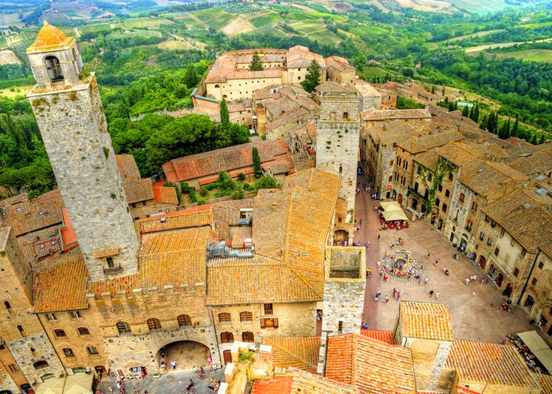 San Gimignano is in Tuscany, 56 km south of Florence, in the northern tip of the province/district of Siena. The epithet "delle belle torri" (of the beautiful towers) is linked to the 14 noble towers that remained, which in ancient times were 72.