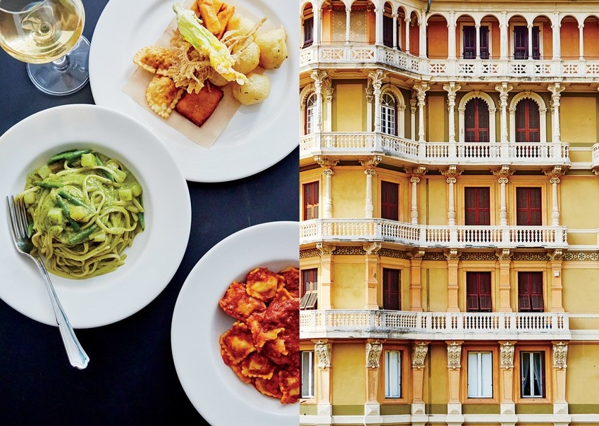 In each shady stone artery a glass window displays Genoese specialties—tiny crisp, fried anchovies, stuffed eggplant, oven-roasted snails, golden pancakes of farinata, torte of chard and herbs, gelati in wildflower hues. But Giacomo, chattering on the phone to the owner of Il Genovese, where we’ve booked, drags me away from these culinary delights.